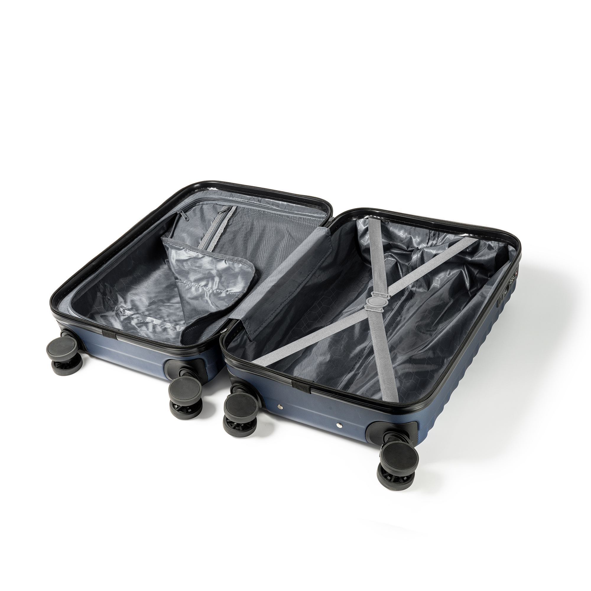 Valigia trolley rigida in ABS resistente. Due scomparti principali e tasca interna a rete. Blocco di sicurezza TSA incorporato incluso.