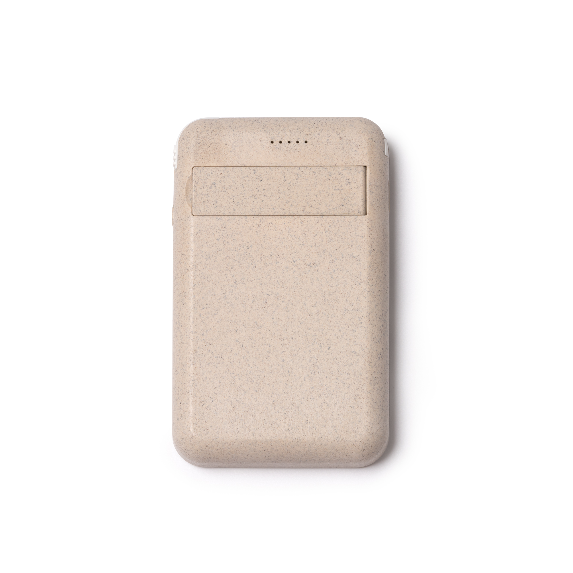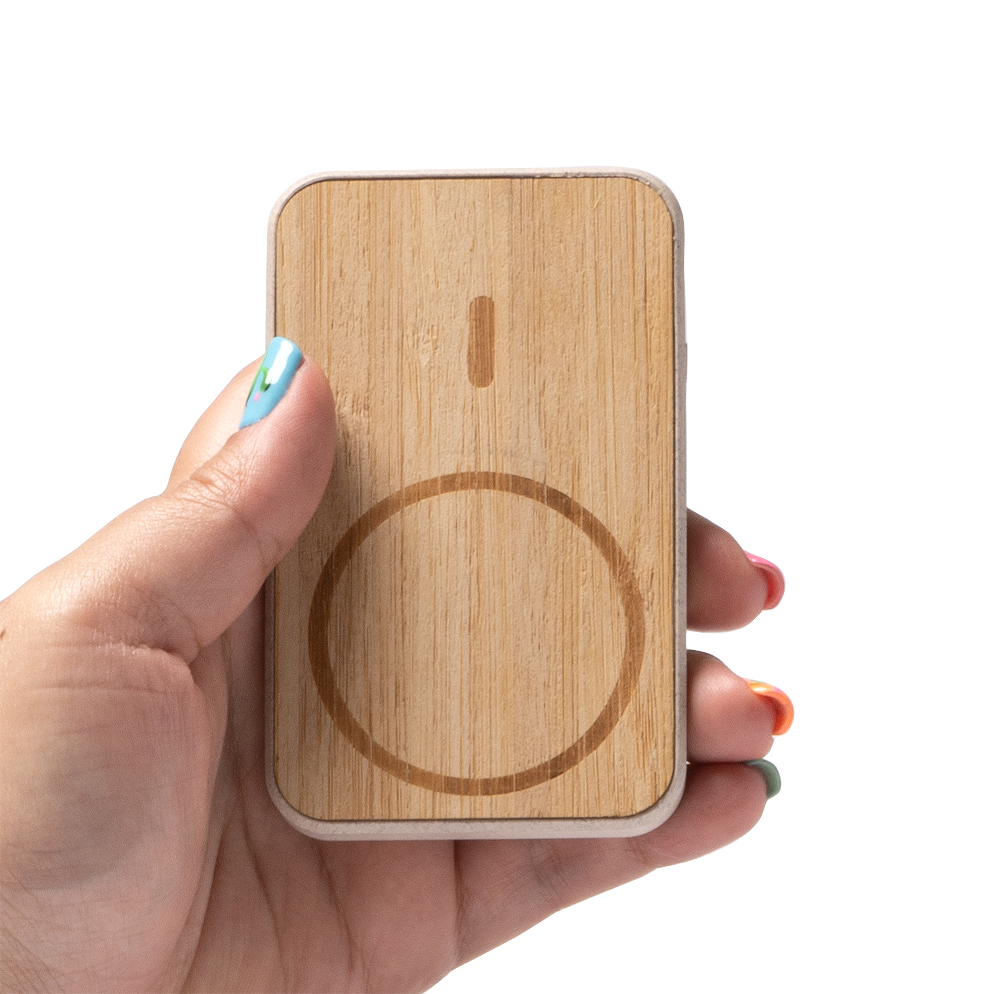 Con la batteria esterna da 5000 mAh con corpo in bambù e fibra di grano e caricabatterie wireless magnetico, potrete tenere in carica i vostri dispositivi in modo pratico ed ecologico, godendo della comodità del supporto integrato.