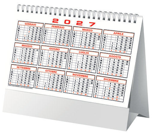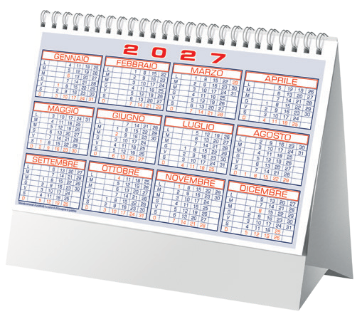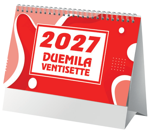D069 – Calendario da Tavolo – Mensile 13 FF – Carta Patinata Opaca – 2 Colori – Spiralato – Tabella 202 in ultima pagina – Imballo : 100pz – Misure : 19×14.5cm – Misura Piedino : 19×3.5cm – Area Stampabile : 18×2,7cm