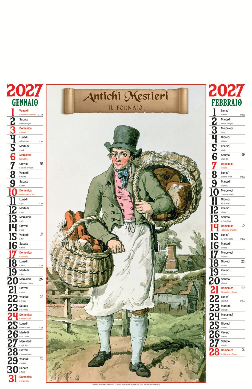 D013 – Calendario Illustrato Antichi Mestieri 6 FF – Carta Patinata – Termosaldato – Imballo : 100pz – Misure : 32×49.5cm – Area Stampabile : 32x10cm