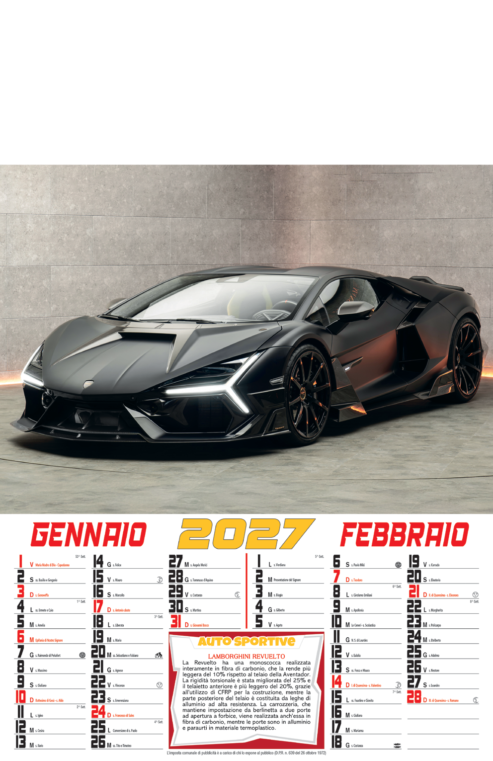 D040 – Calendario Illustrato Auto Sportive 6 FF – Carta Patinata – Termosaldato – Imballo : 100pz – Misure : 32×49.5cm – Area Stampabile : 32x10cm