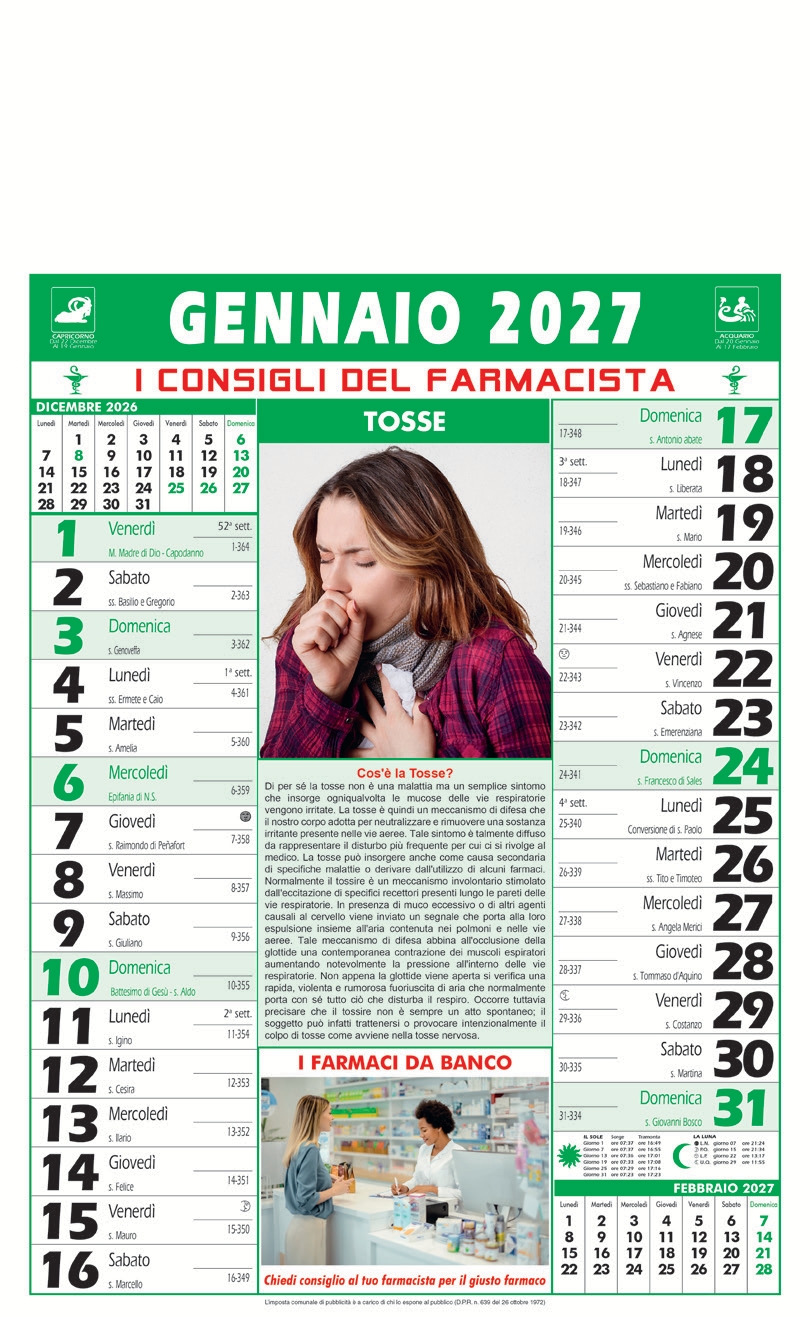 D049 – Calendario Illustrato Farmacia – 12 FF – Carta Patinata – Termosaldato – Imballo : 100pz – Misure : 28.8x47cm – Area Stampabile : 28.8x9cm