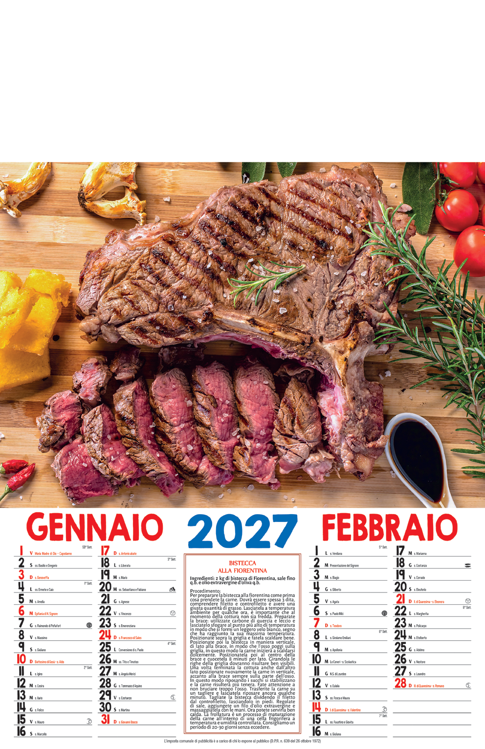 D008 – Calendario Illustrato Gastronomia Carne 6 FF – Carta Patinata – Termosaldato – Imballo : 100pz – Misure : 32×49.5cm – Area Stampabile : 32x10cm