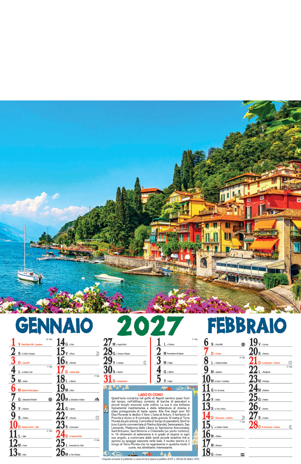 D036 – Calendario Illustrato Mari e Monti – 6 FF – Carta Patinata – Termosaldato – Imballo : 100pz – Misure : 32×49.5cm – Area Stampabile : 32x10cm