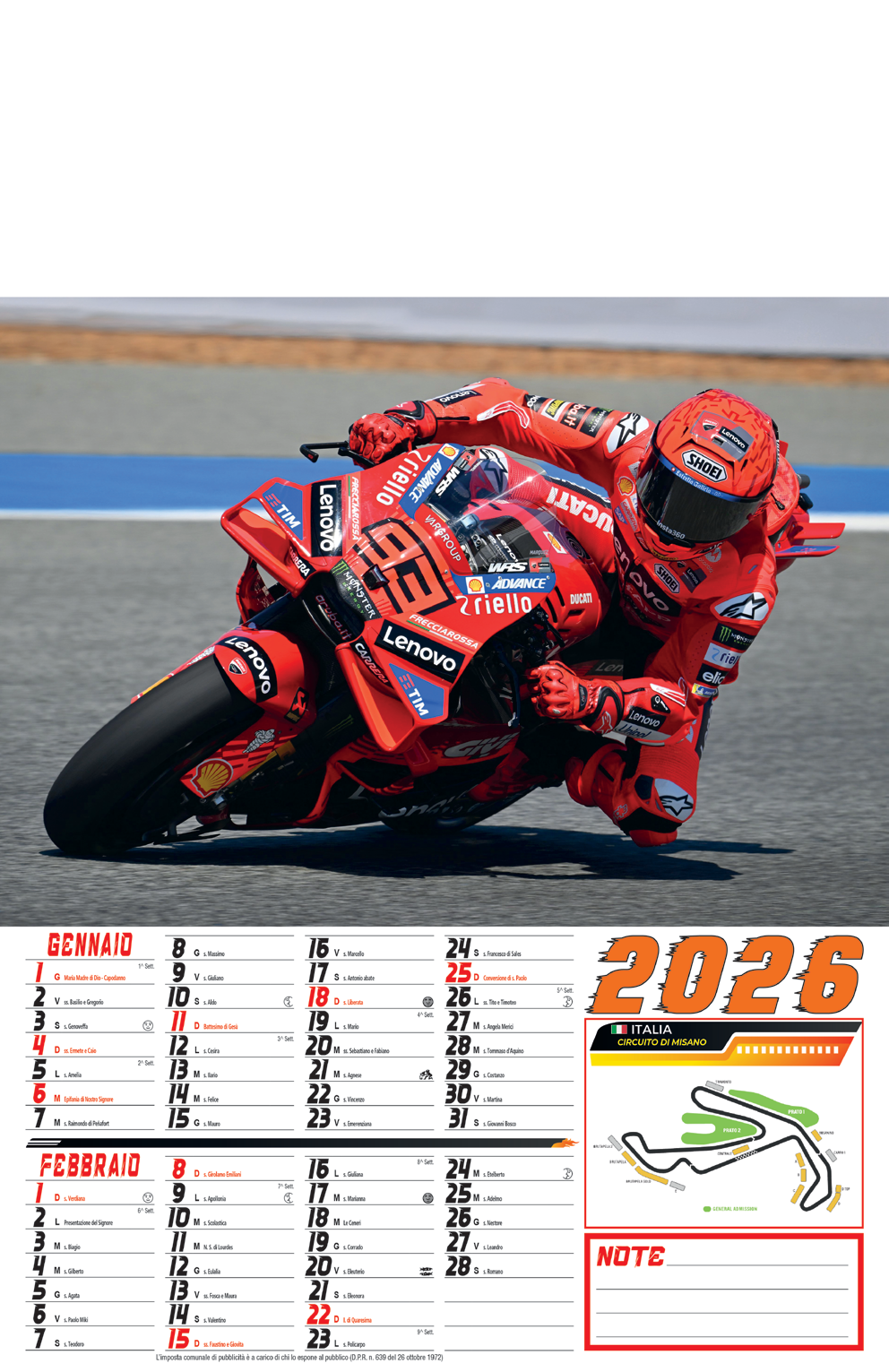 D039 – Calendario Illustrato Motomondiale – 6 FF – Carta Patinata – Termosaldato – Imballo : 100pz – Misure : 32×49.5cm – Area Stampabile : 32x10cm