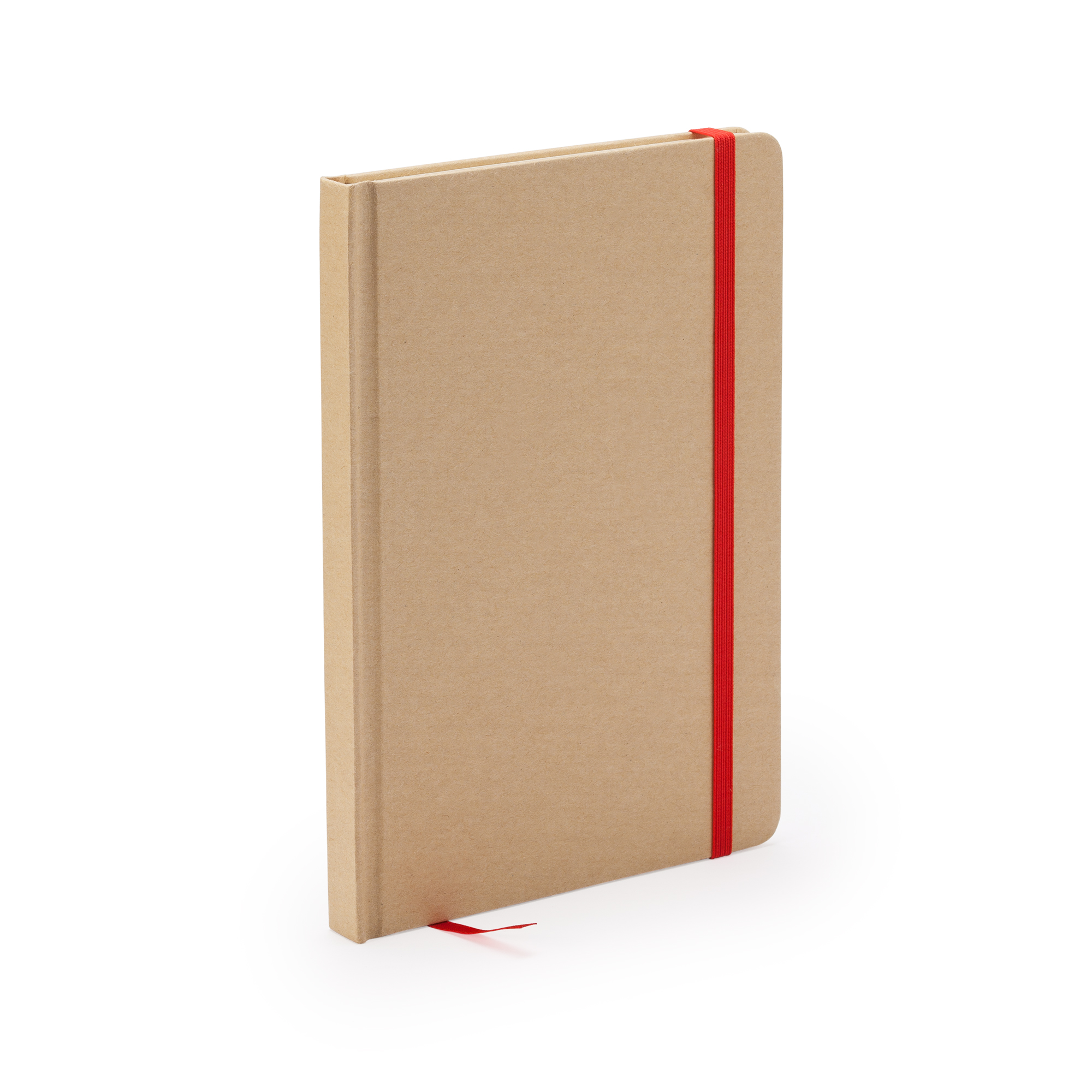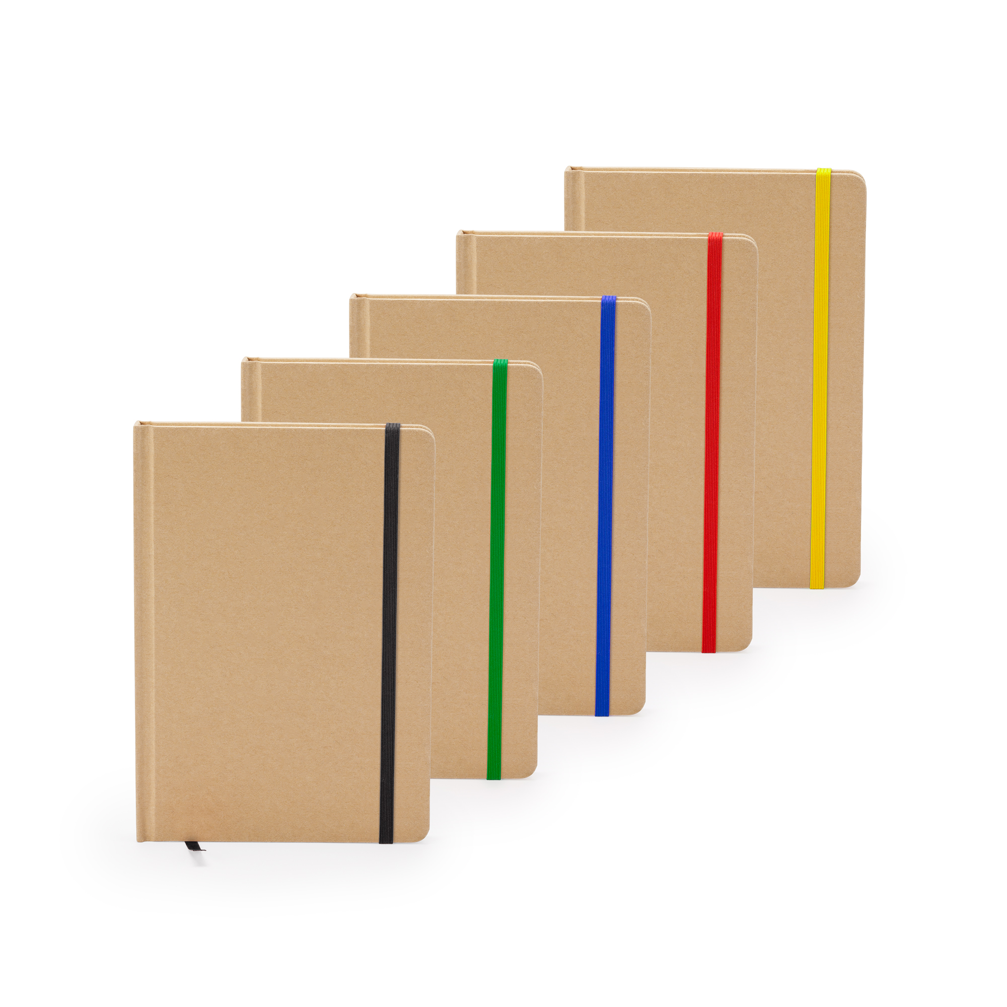 Blocco note A5. Copertina rigida in cartone riciclato. Segnapagina a colori ed elastico. 100 fogli.