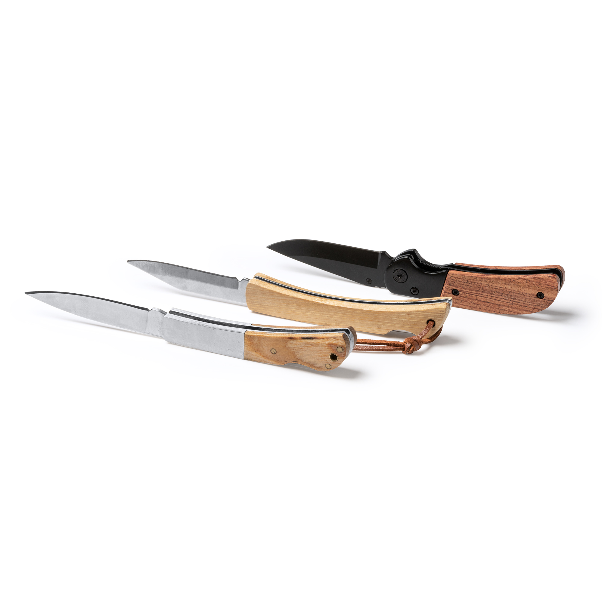 Coltello a serramanico in acciaio inox con impugnatura in bambù. Cinturino per il trasporto incluso. Confezione in scatola dal design ecologico.