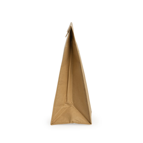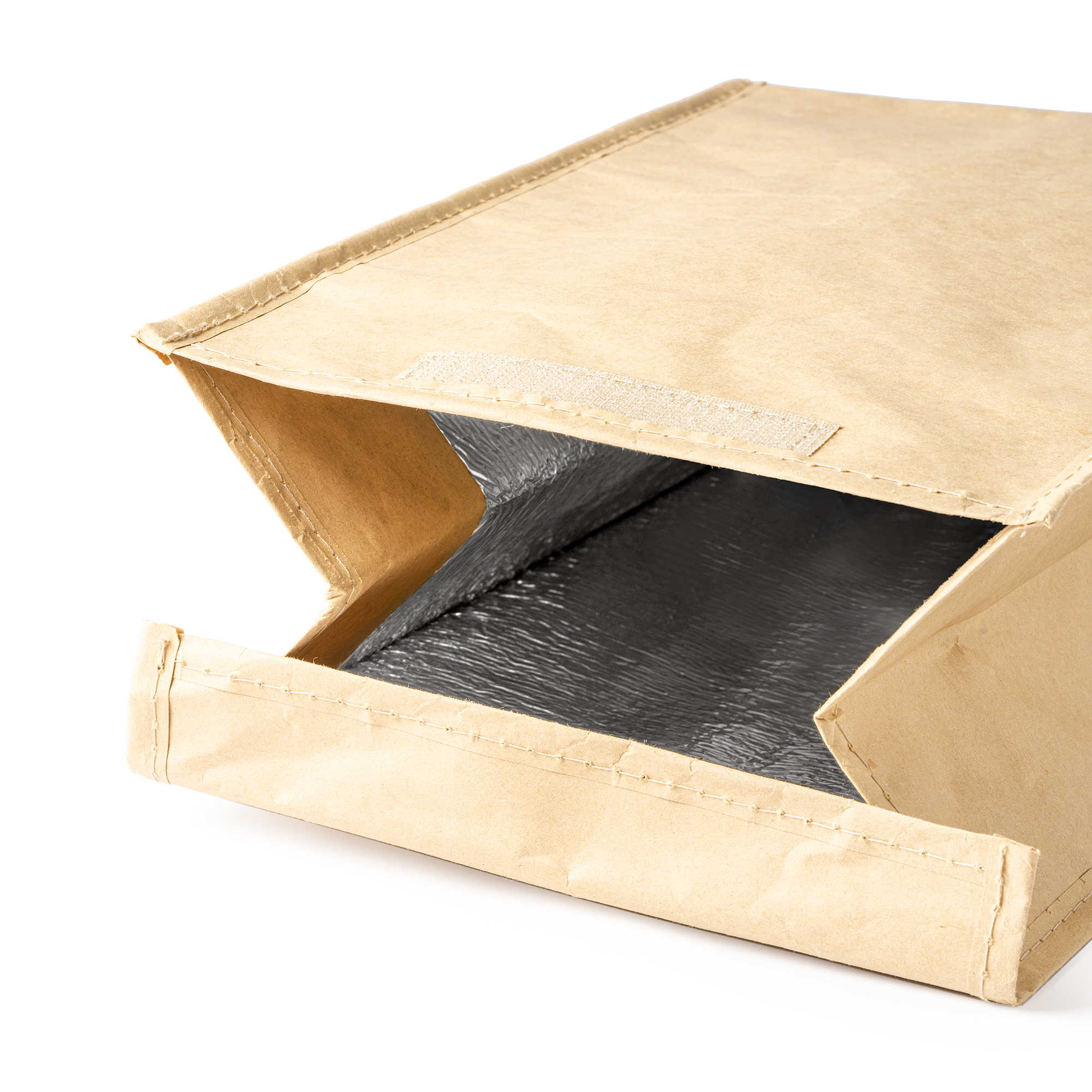 Borsa termica in carta laminata con interno in alluminio isotermico. Porta le tue bevande o il tuo cibo ovunque alla giusta temperatura. Patta e tasca esterna con chiusura in velcro.