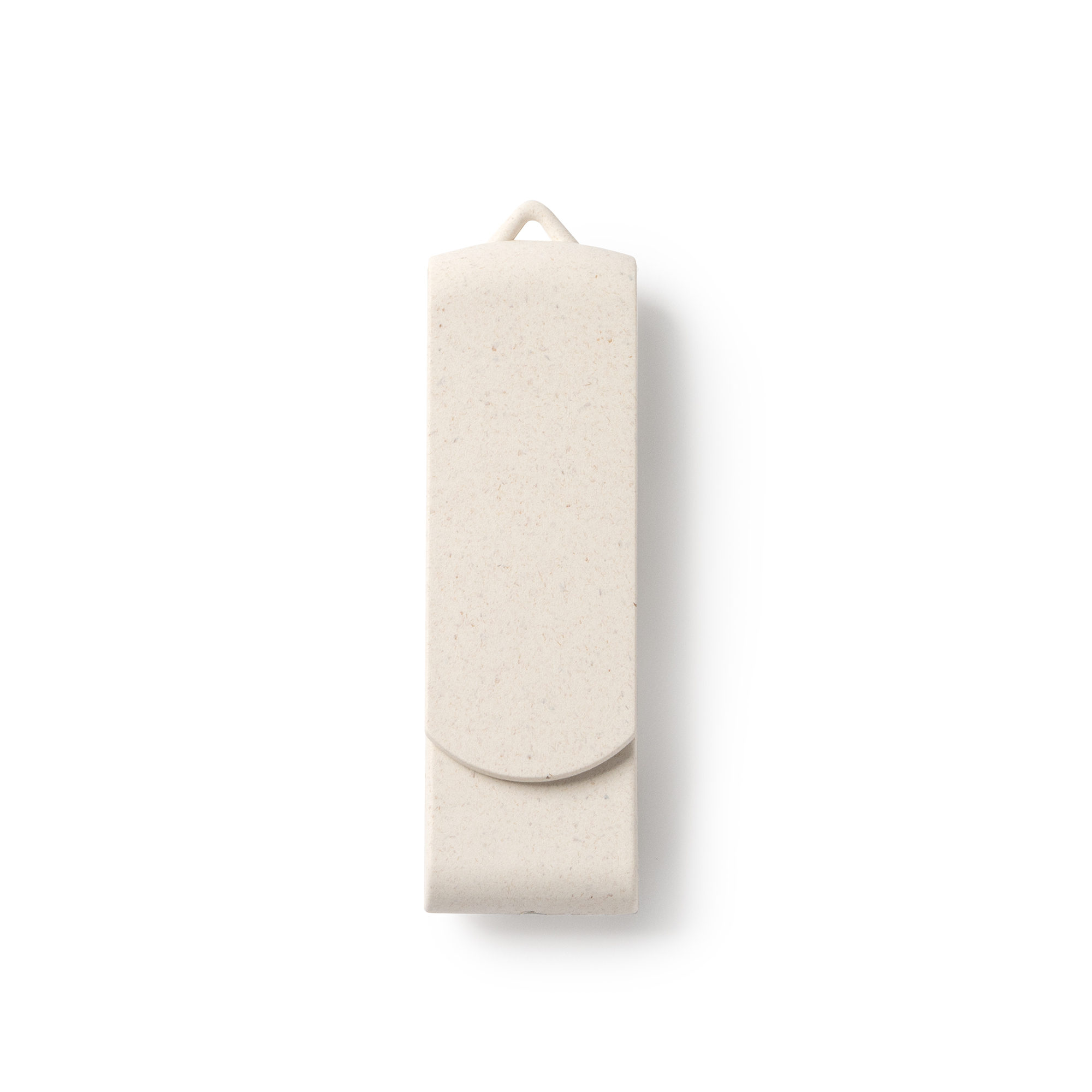 Chiavetta USB con struttura principale e clip girevole in fibra di grano. Confezione in scatola dal design ecologico.