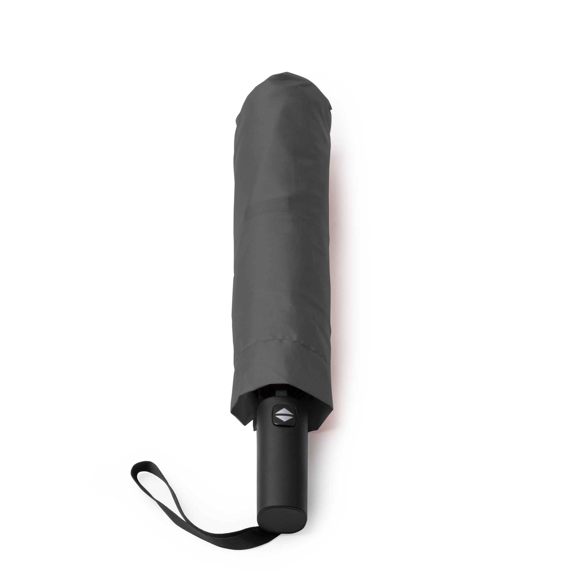 Ombrello pieghevole da tempesta con apertura e chiusura automatica, manico in gomma. Tessuto pongee 190T con custodia abbinata. Stecche in fibra di vetro nera.