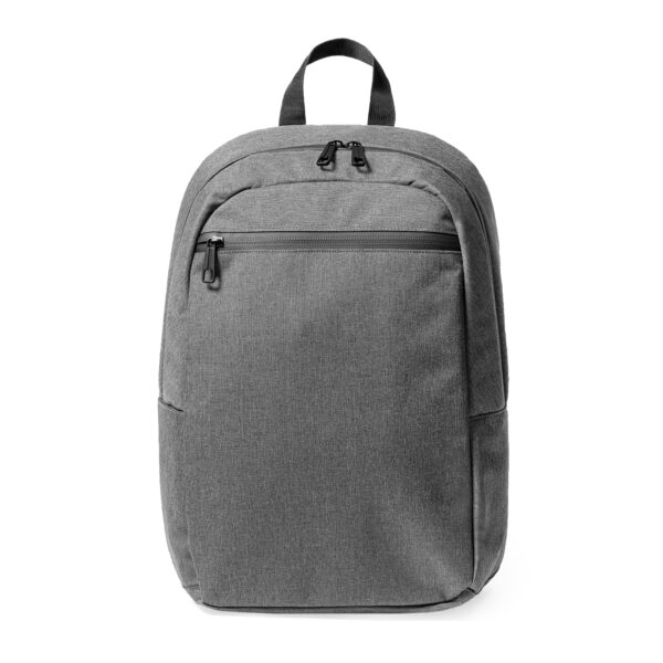 Zaino realizzato in poliestere riciclato RPET 600D dal design vigoré. Corpo imbottito e tasca interna ideale per laptop. Doppio scomparto con cerniera impermeabile e tasca esterna. Manici imbottiti e tracolla per trolley.