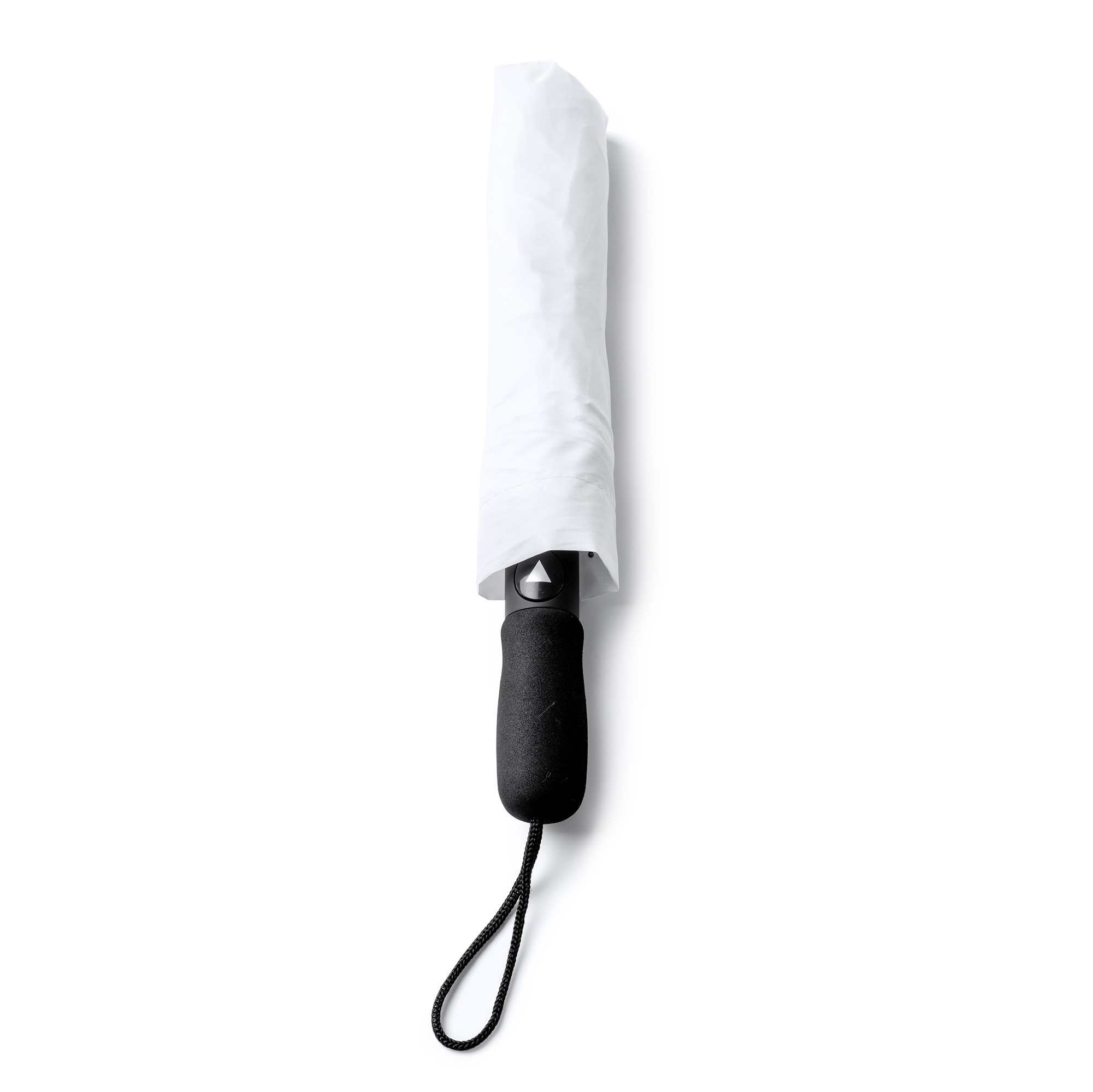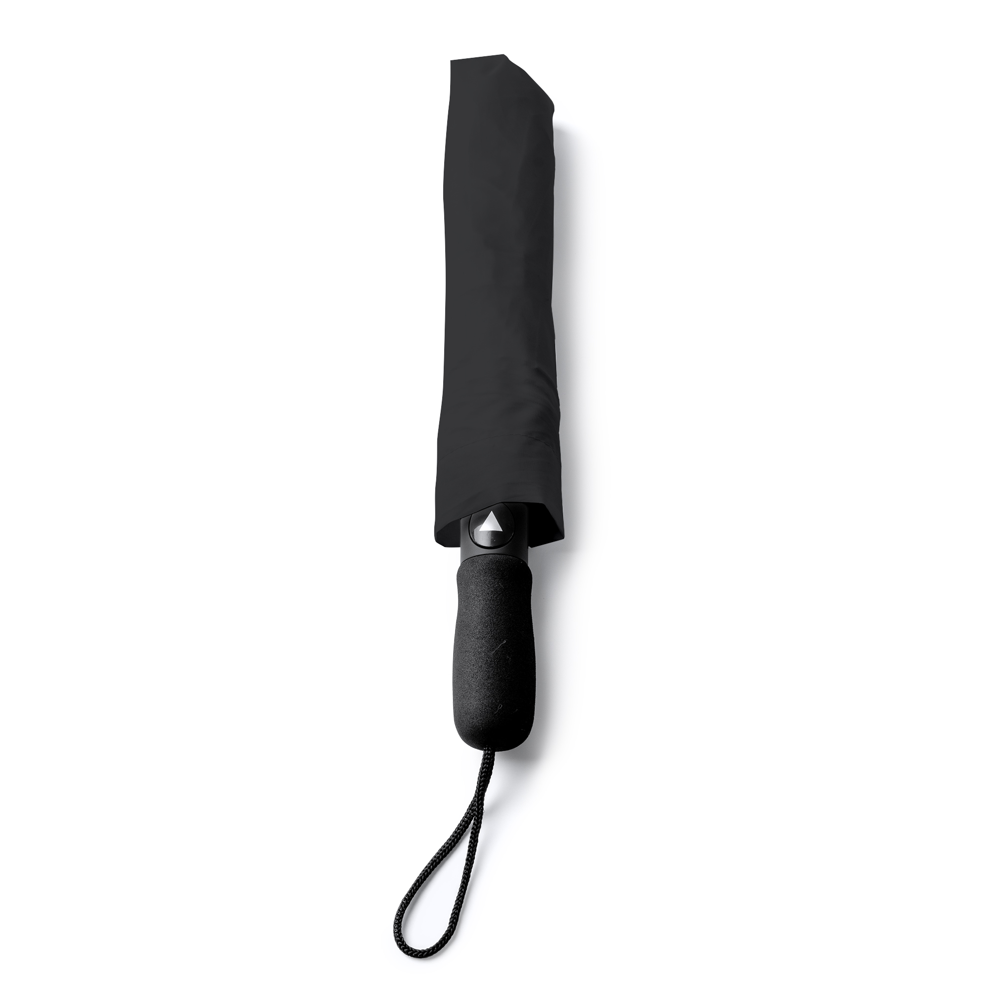 Ombrello richiudibile con apertura automatica. Tessuto pongee 190T con custodia abbinata. Manico in EVA e sezioni in metallo nero.