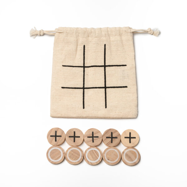 Gioco di tris in legno. Include 10 pezzi contenuti in un sacchetto di cotone naturale.