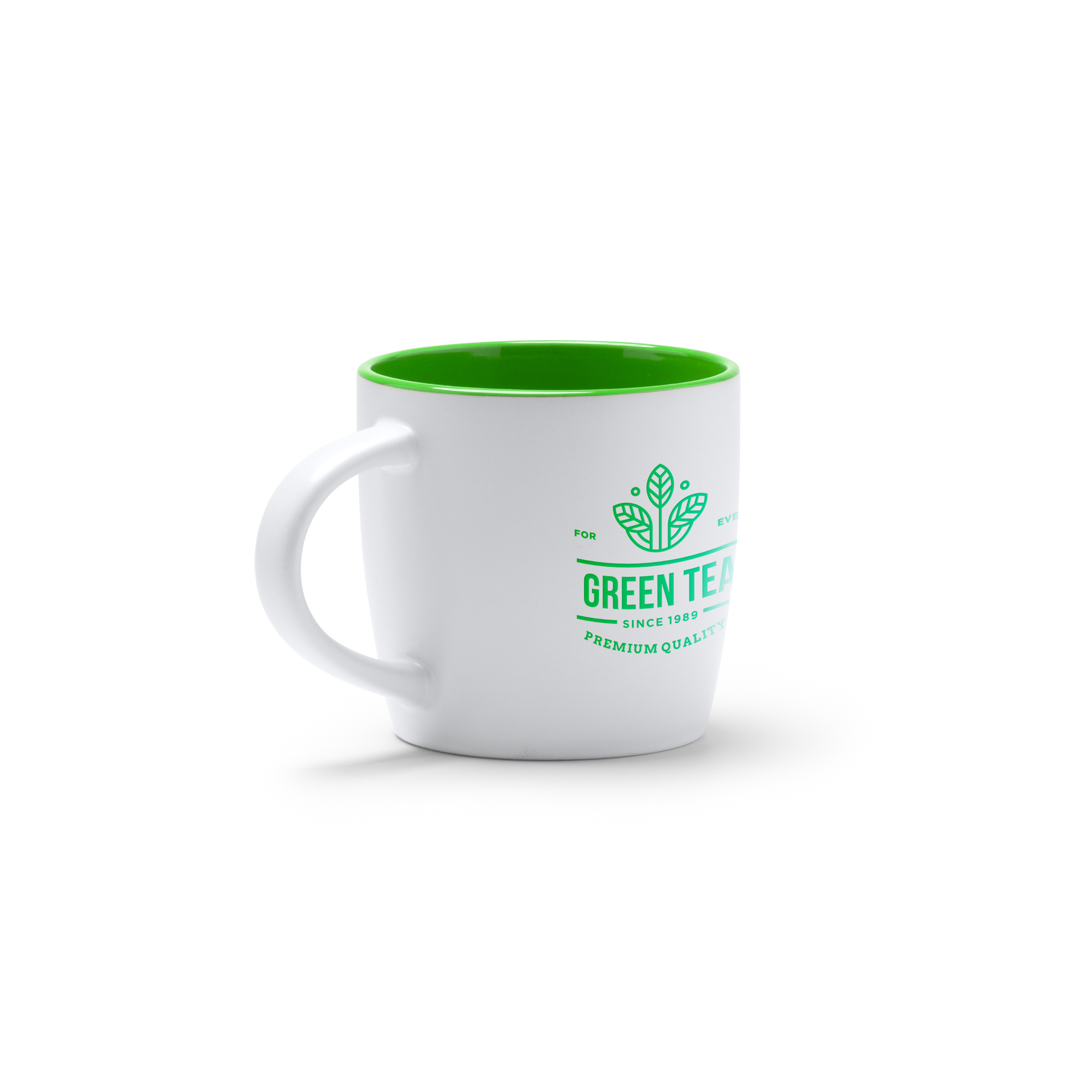 Tazza in ceramica da 370 ml. Interni a colori ed esterni bianchi.