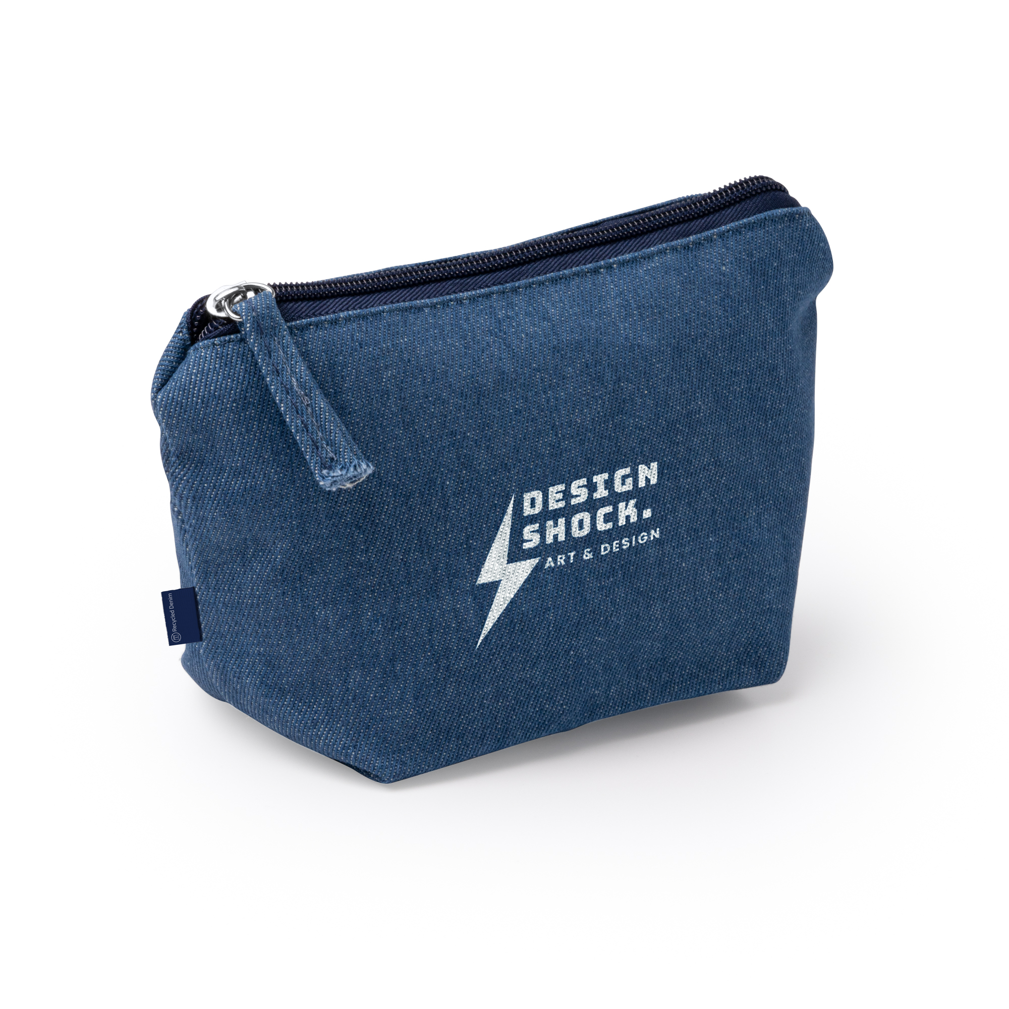 Borsa da toilette in denim riciclato con chiusura a cerniera abbinata.