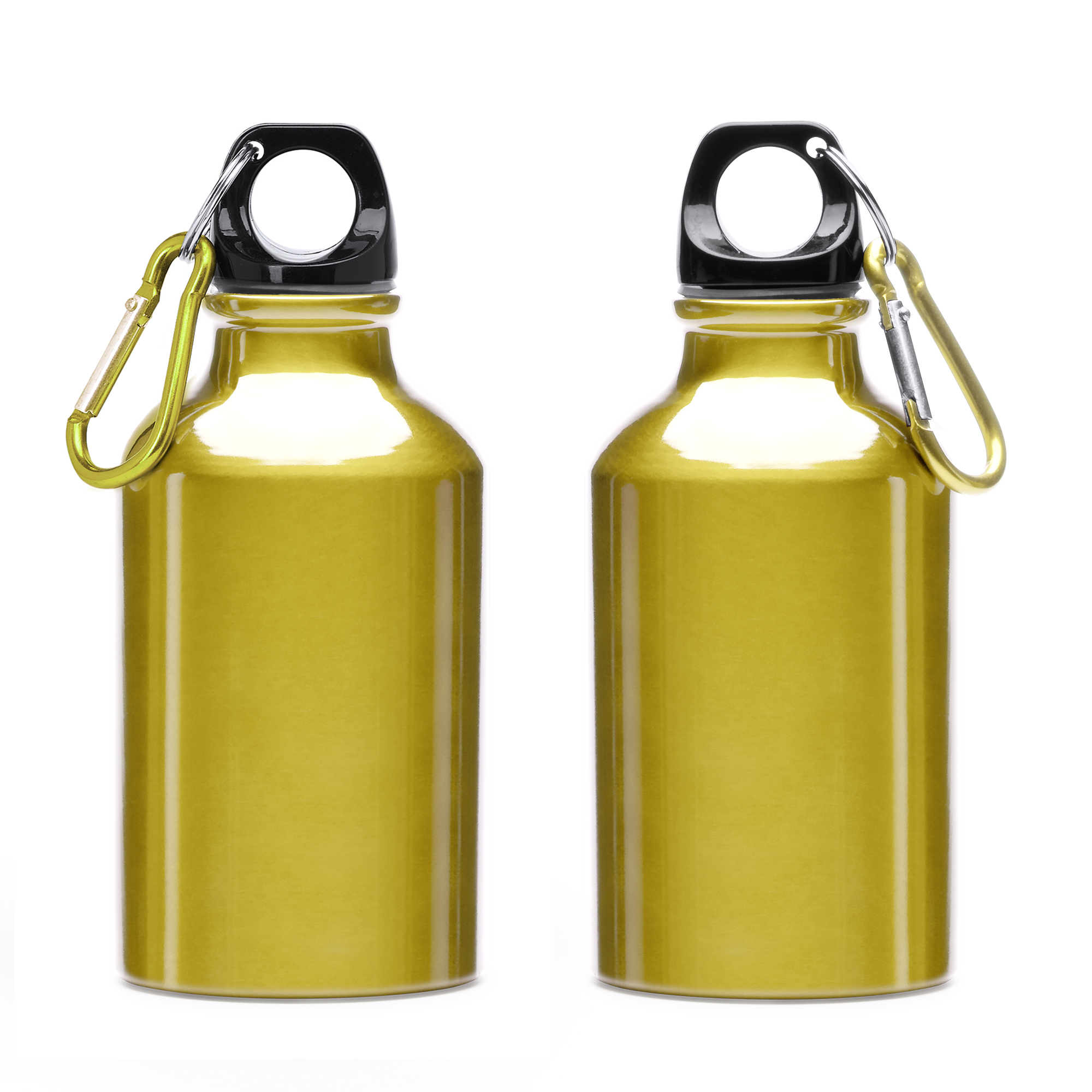 Bottiglia in alluminio con moschettone. Tappo nero e moschettone dello stesso colore metallico della bottiglia. Capacità 330 ml. Le sue dimensioni consentono di portarla sempre con sé.