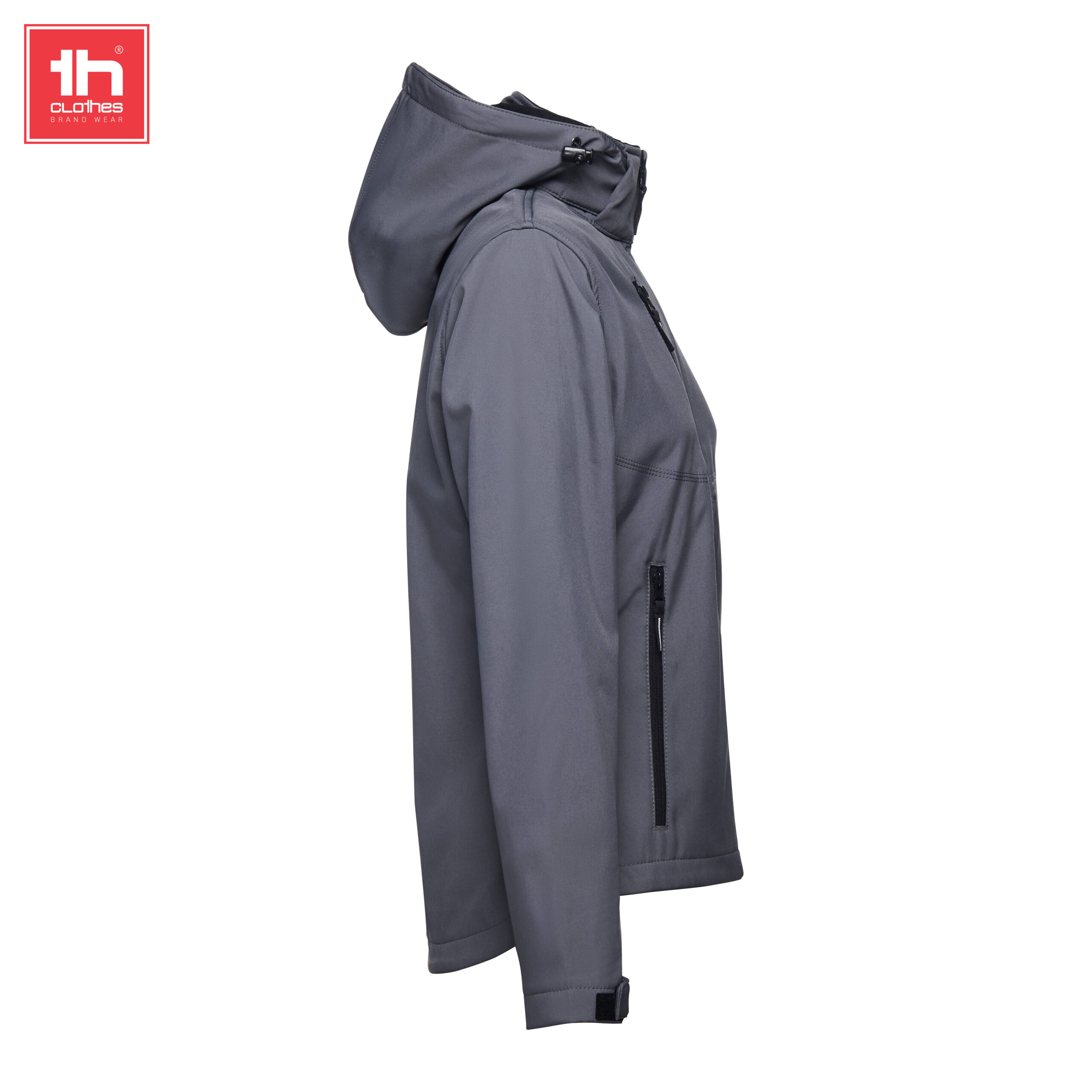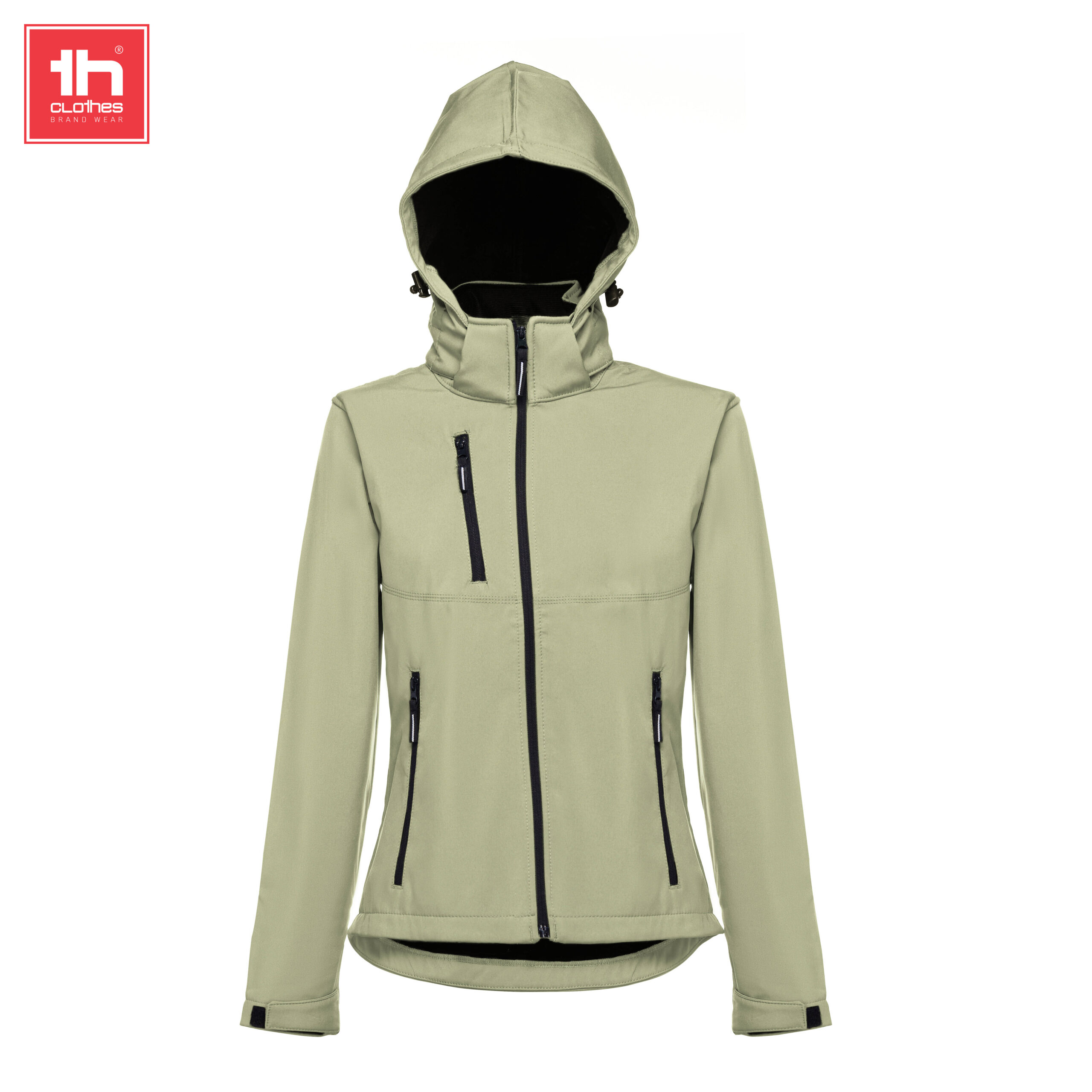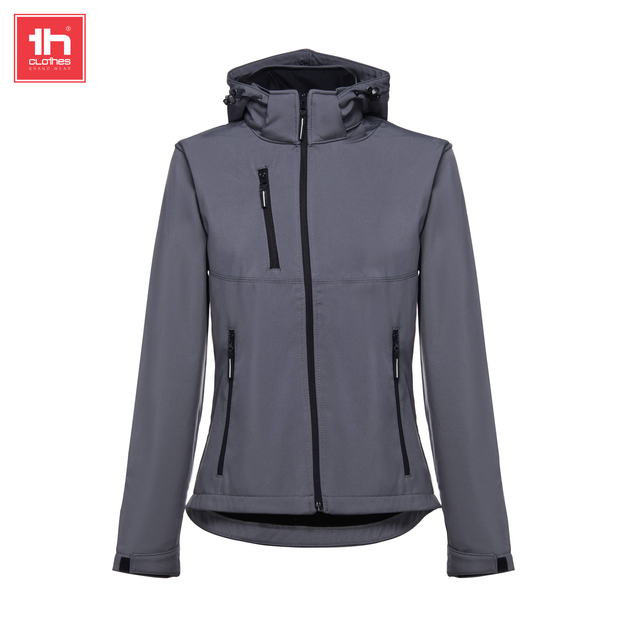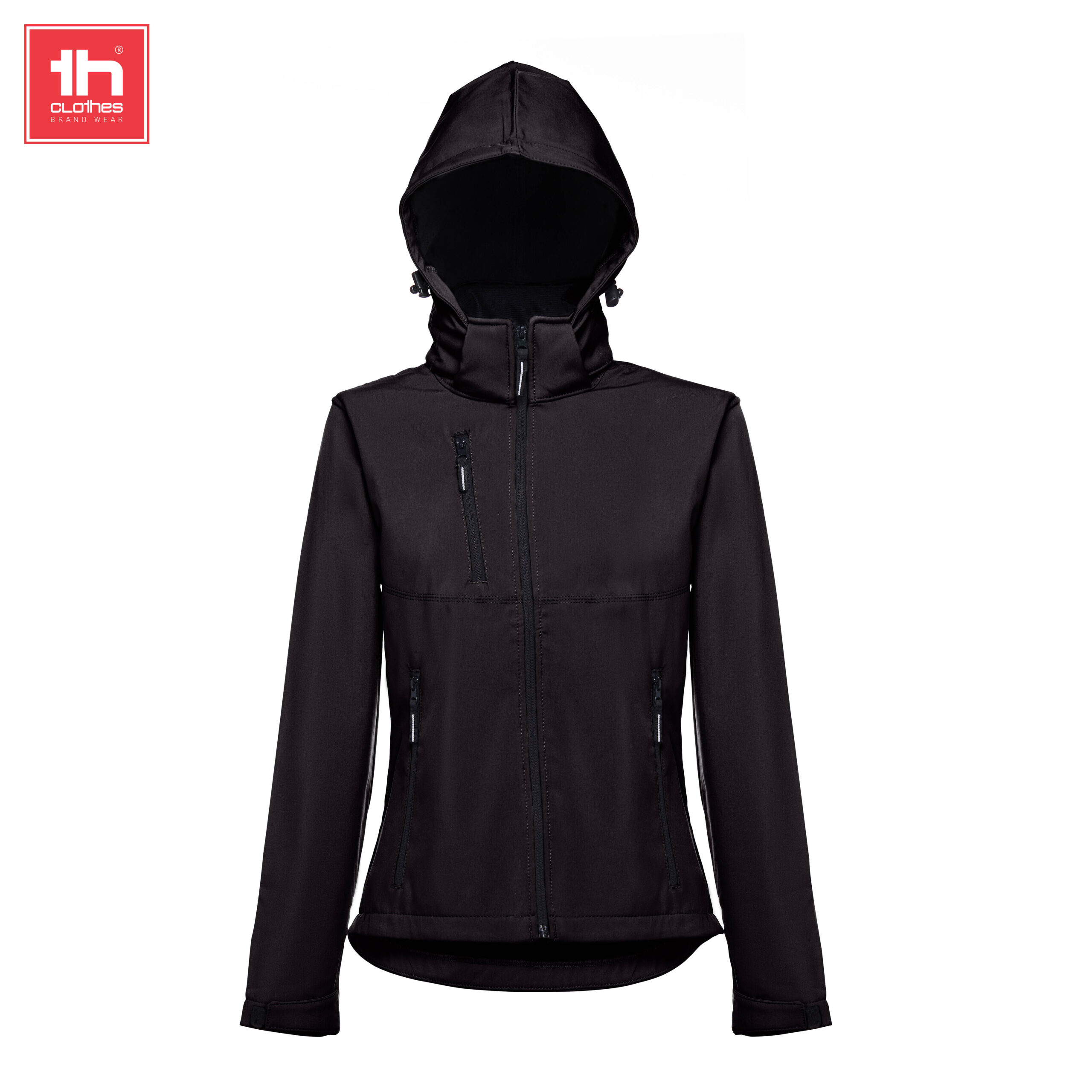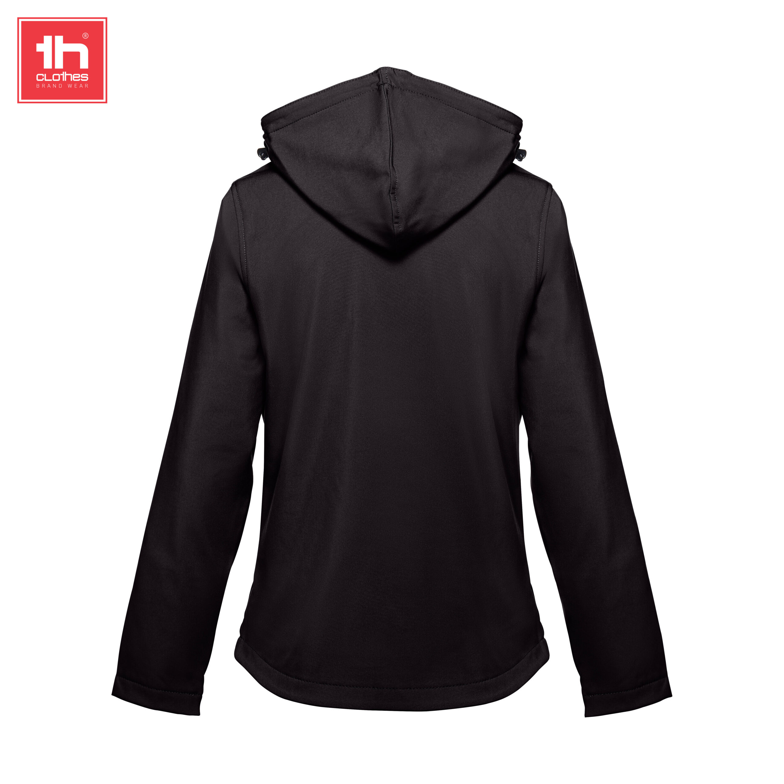 Softshell da donna con cappuccio rimovibile 280 g/m² · 96% poliestere, 4% elastan a due strati · Articolo idrorepellente· Foderato con rete in pile · 2 tasche frontali con cerniere · Tasca diagonale sul petto con cerniera· Polsini regolabili con cinturino in velcro· Cappuccio rimovibile con cerniera e cinturino in velcro per adattarsi al colletto· Arrotondato nella parte bassa della schiena· Apertura con cerniera YKK®· Cappuccio regolabile con elastico e stopper